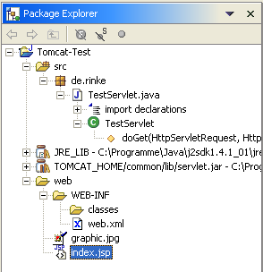 Dies Beispiel soll zeigen, wie man zunächst noch ohne spezielle Unterstützung von Plugins ein Projekt mit Tomcat aufbaut. Der Package-Explorer zeigt folgende Struktur: