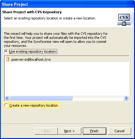 Wer zuvor noch nie mit CVS gearbeitet hat, muss nun zuerst eine Repository-Location anlegen, damit also bestimmen, welchen CVS-Server man verwenden möchte. Wenn schon mal mit CVS gearbeitet wurde, dann werden die bereits bekannten CVS-Server aufgelistet und man kann einfach einen auswählen.