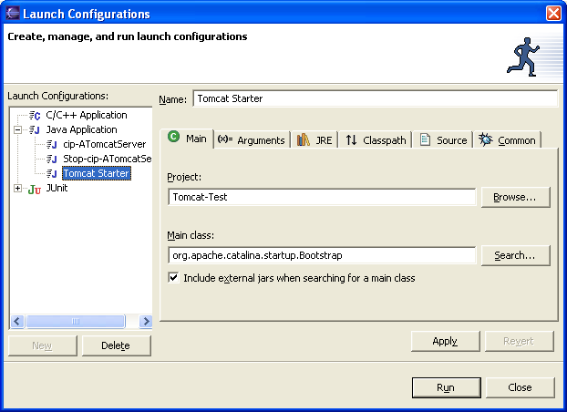 Neben Zuordnung zu einem Projekt und dem Benennen muss vor allem der Start-Punkt festgelegt werden. Im Falle von Tomcat ist das „org.apache.catalina.startup.Bootstrap“ das im „bootstrap.jar“ im bin-Verzeichnis von Tomcat liegt. Als Argument muss man „start“ übergeben und falls noch nicht geschehen, muss das Archiv „bootstrap.jar“ auch in den Classpath aufgenommen werden. Dies alles erledigt man in den unterschiedlichen Abschnitten des Dialogs und hat damit eine Startkonfiguration für Tomcat erstellt.