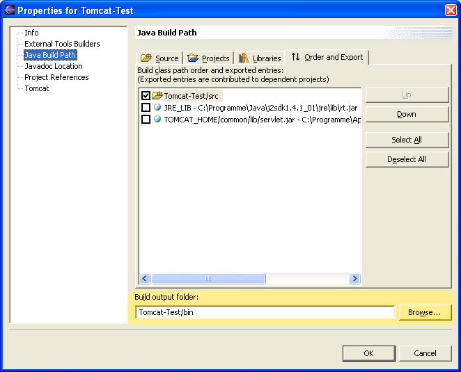 Zunächst einmal sollte man dafür sorgen, dass die Sourcecodes grundsätzlich von den erzeugten Class-Files getrennt bleiben. Hierfür ändert man im Dialog „Windows - Preferences“ den Source-Folder-Name auf „src“ und die Output-Location auf „bin“. Für WebServices ist es evtl. sogar besser das Output-Verzeichnis gleich so einzustellen, dass alles Class-Files dort landen, wo der Applicationserver sie erwartet („WEB-INF/classes“). Das kann man aber auch in der Project-Preferences für jedes Projekt getrennt einstellen.