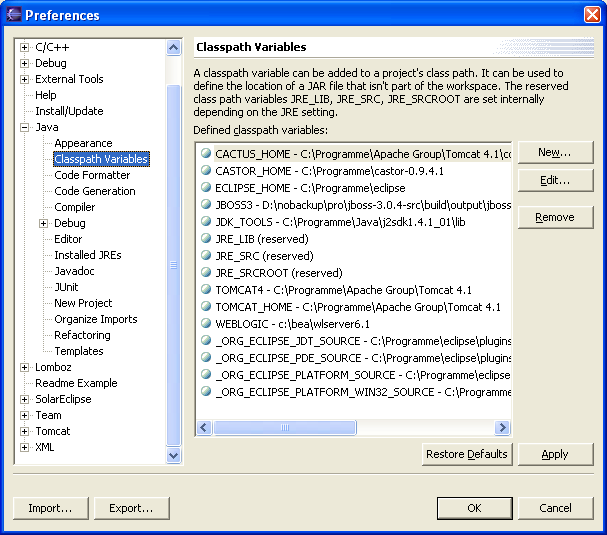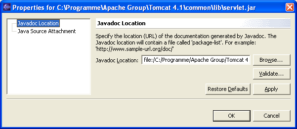 Außer der Laufzeit-Bibliothek muss man bei praktisch jedem Projekt andere Bibliotheken mit einbinden. Da diese bei jedem Entwickler auf unterschiedlichen Pfaden installiert sein können, benutzt man sogenannte Classpath-Variablen. Im Projekt werden so nur symbolische Namen gespeichert, die jeder Entwickler auf seine lokale Installation anpassen kann. Braucht man z.B. „servlet.jar“ von Tomcat, dann wird sie im Projekt als „TOMCAT_HOME/common/lib/servlet.jar“ referenziert. Wo Tomcat dann genau installiert ist, wird vom Entwickler selbst festgelegt in dem er den Wert von TOMCAT_HOME entsprechend seiner lokalen Installation einstellt. Wenn man in einem Team entwickelt und relativ neue Technologien im Einsatz hat, dann ändern sich Versionen der zugehörigen Bibliotheken sehr schnell. Damit nicht das heillose Chaos ausbricht und seltsame Effekte auftreten, die auch noch von einem zum anderen Teammitglied unterschiedlich ausfallen, ist es sehr wichtig, dass alle immer die gleichen Versionen alle Komponenten verwenden. Deshalb empfehle ich immer Namen für Bibliotheken zu verwenden, die schon im Namen die Versionsnummer enthalten. z.B. „castor-0.4.1.jar“. Wenn alle Bibliotheken auch so im Projekt referenziert werden, ist sichergestellt, dass alle das Gleiche verwenden. Man kann die eingebaute Dokumentation sehr leicht erweitern mit eigenen Texten erweitern. Zum einen lassen sich alle mit JavaDoc erzeugten API-Dokumentationen direkt einbinden. Das gilt zu allererst natürlich für das Java-SDK selbst, aber dann natürlich auch für alle im Projekt benutzten Bibliotheken. Zum anderen können Plugins ihre Dokumentation nahtlos integrieren, als Beispiel gibt's im Download-Bereich diesen Artikel auf als Plugin, wo durch er eben in der Eclipse Hilfe erscheint. Um die Möglichkeiten voll auszunutzen, sollte man zu jeder verwendeten Bibliothek (JAR-File) die entsprechende API-Dokumentation, sowie den Sourcecode (soweit verfügbar) zuordnen. Wenn man ein komplettes JDK installiert inklusive Source erkennt Eclipse das automatisch. Für alle individuellen Bibliotheken ordnet man über die Properties eines jeden JARs (erreichbar über das Kontextmenü) die Dokumentation und das Source-Archiv zu. Entsprechend wird auch die API-Dokumentation des eigenen Projekts mit eingebunden: