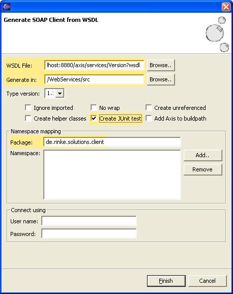 Um von Java aus auf WebServices zugreifen zu können, gibt es mehrere Möglichkeiten. Die einfachste ist ausgehend von einer WSDL-Datei einen Stub erzeugen zu lassen, der den WebService auf der Clientseite repräsentiert. Diesen Stub kann man dann genauso benutzen wie jede andere Java-Klasse. Dass dahinter ein WebService die Arbeit verrichtet merkt man gar nicht[4]. Das Axis-Framework liefert zu diesem Zweck ein Tool mit Namen WSDL2Java was solche Stubs generieren kann. Da das direkte Aufrufen doch eher umständlich ist, lassen wir das das Lomboz-Plugin erledigen: Man kann entweder die WSDL-Datei vom Filesystem lesen, dann muss man sie zuvor mit dem Browser mit „Speichern unter ...“ gesichert haben. Alternativ kann man auch direkt eine URL eingeben: http://localhost:8080/axis/services/Version?wsdl Wenn man zusätzlich „create Unittest“ ankreuzt, wird auch gleich ein Unittest erzeugt, der zeigt wie man die generierten Klassen einsetzt. Der TestCase verlangt allerdings junit.jar auf dem Classpath, so dass man die Projekteigenschaften entsprechend anpassen muss. Anschließend finden sich im angegebenen Package vier neue Quellcode-Files, die zusammen den Client für den Zugriff auf den „Version“-WebService ermöglichen: