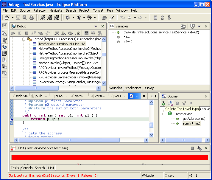 Da der WebService mitsamt Tomcat komplett in Eclipse läuft kann man einfach in der implementierenden Klasse einen Breakpoint setzen.