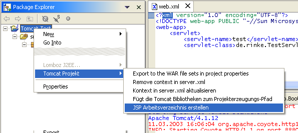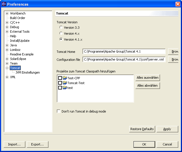 To develop web services with Eclipse a couple of plugins are recommended. The Tomcat plugin of Sysdeo is well suitable for simple projects with Tomcat as application server. Since I would like to develop and debug web services with Tomcat as container later, it is used in this project. Substantially however the Lomboz Plugin of ObjectLearn supplies more functionality. In addition, it is primarily helpful for developing EJB applications, but also has a few functions for web services.