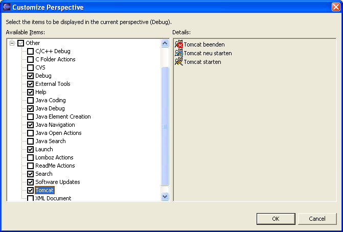 Thus the Plugin can be used. In „Windows/Customize Perspective“ one activates the plugin in the „Debug-Perspective“: