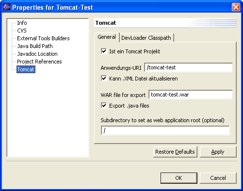 From now on you can choose „Tomcat project“, when creating a new project. An existing project can be change to „Tomcat project“ in „Project-Properties“: